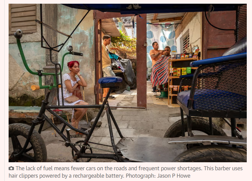 上图为英国《卫报》2�日一篇报道的配图,显示古巴人努力适应燃料和能源短缺的生活,图中古巴一名理发师正用充电型剃刀为客人理发。